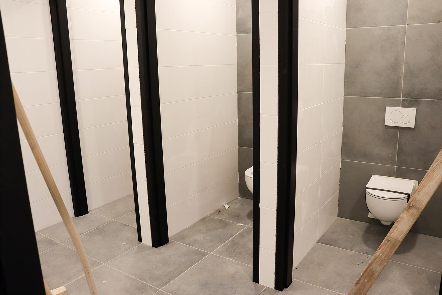 Inmiddels zijn alle muren voorzien van een likje verf. De vloer van Floer ligt er grotendeels in, op een paar plekken na. Hier wordt nog hard gewerkt aan het leggen van de laatste stukken vloer. Het plafond met de verlichting is inmiddels door het hele pand klaar. Ook de toiletten zijn betegeld en er hangen ondertussen toiletpotten in. Helaas kan je nog niet naar het toilet, dat moet je nog even ophouden tot volgende week. Vanaf dan is het de verwachting dat de toiletten het ook doen. Sinds kort staat er beneden in de loods een bunker voor alle beits, olie en verf. Hier kan alles veilig worden opgeslagen, om ontploffingsgevaar tijdens een brand bijvoorbeeld te voorkomen.