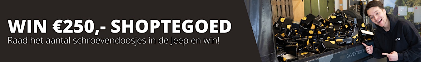 We hebben onze Wovar Jeep tot de nok toe gevuld met doosjes schroeven. Raad jij hoeveel doosjes er in de auto liggen? Degene die het juiste aantal (of het dichtstbijzijnde aantal) raadt, wint €250,- shoptegoed. Wees er snel bij, de actie geldt tot en met maandag 17 maart!
